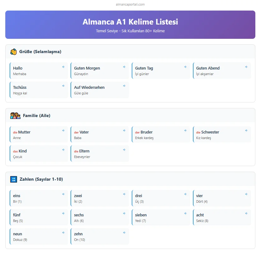 Almanca A1 kelime listesi, öğrencilere temel dilbilgisi yapılarını öğrenme ve doğru telaffuz becerilerini geliştirme fırsatı sunar. Bu liste, dil öğreniminde hızlı ve etkili ilerleme sağlamak için özenle hazırlanmıştır.