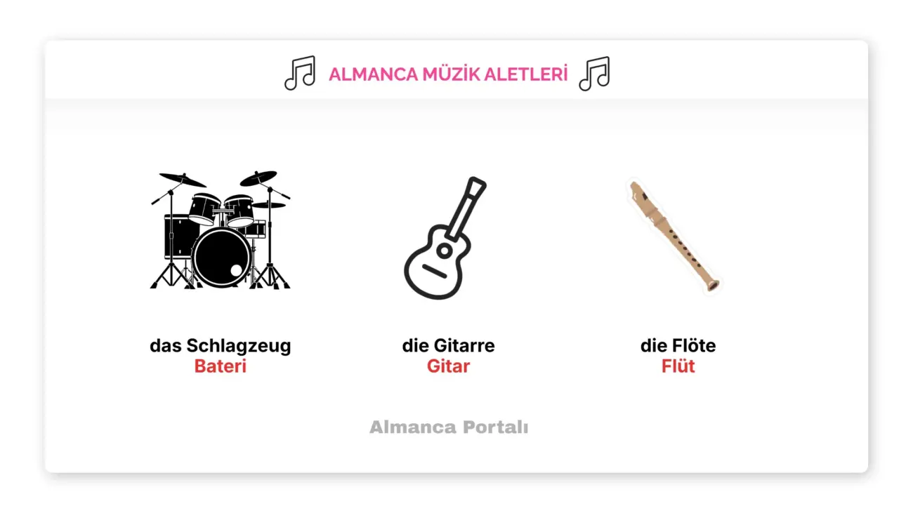 Almanca Müzik Aletleri: Müzik, seslerin ritmik ve melodik bir şekilde düzenlenmesiyle oluşturulan sanatsal bir ifadedir. Müzik genellikle ses perdesi, ritim, tempo, vurgu ve tonalite gibi